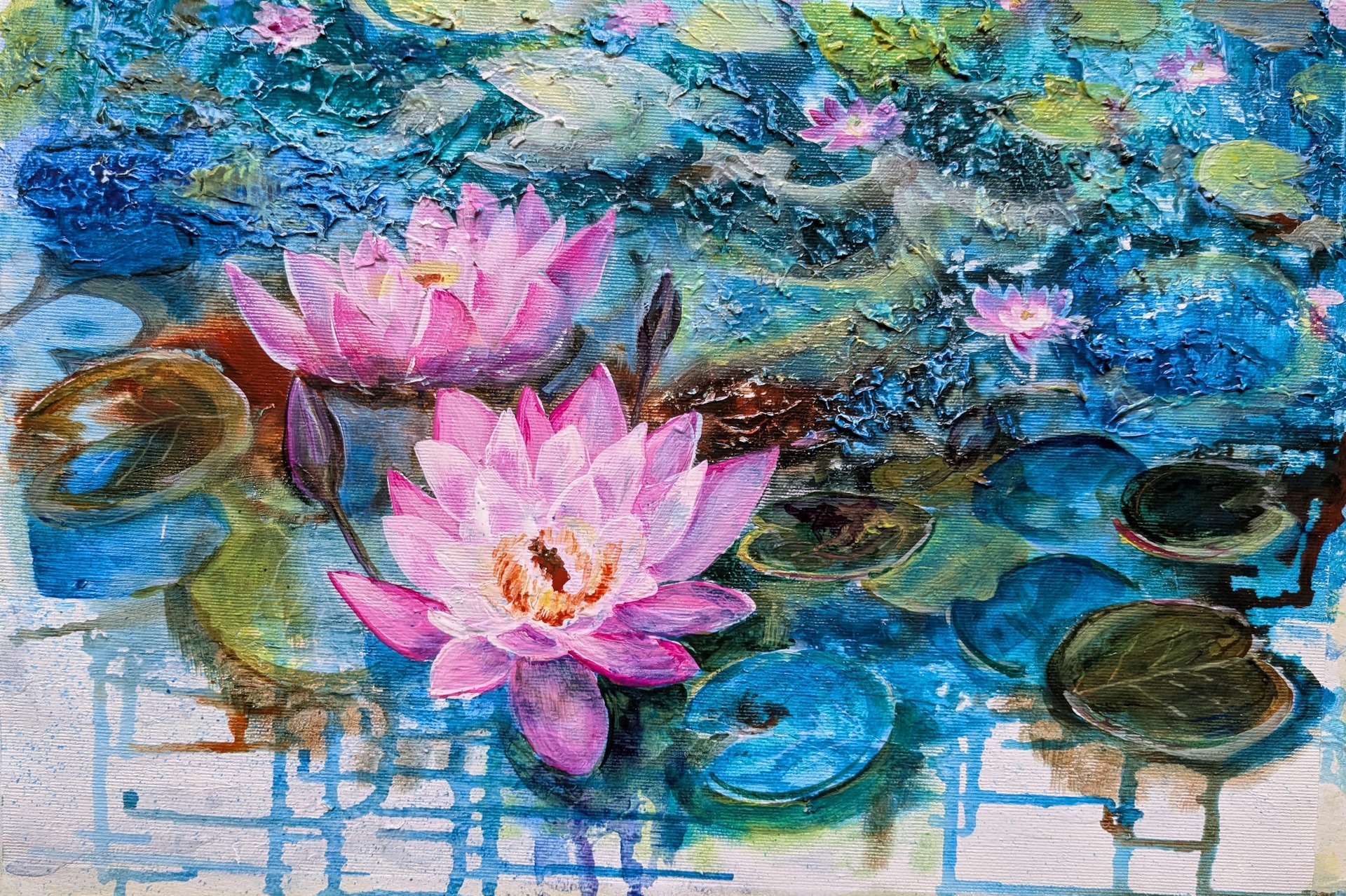 Technikidee: Mit Flüssigen Acrylfarben einen Hintergrund erzeugen und dann eher realistisch die Blüten ausarbeiten