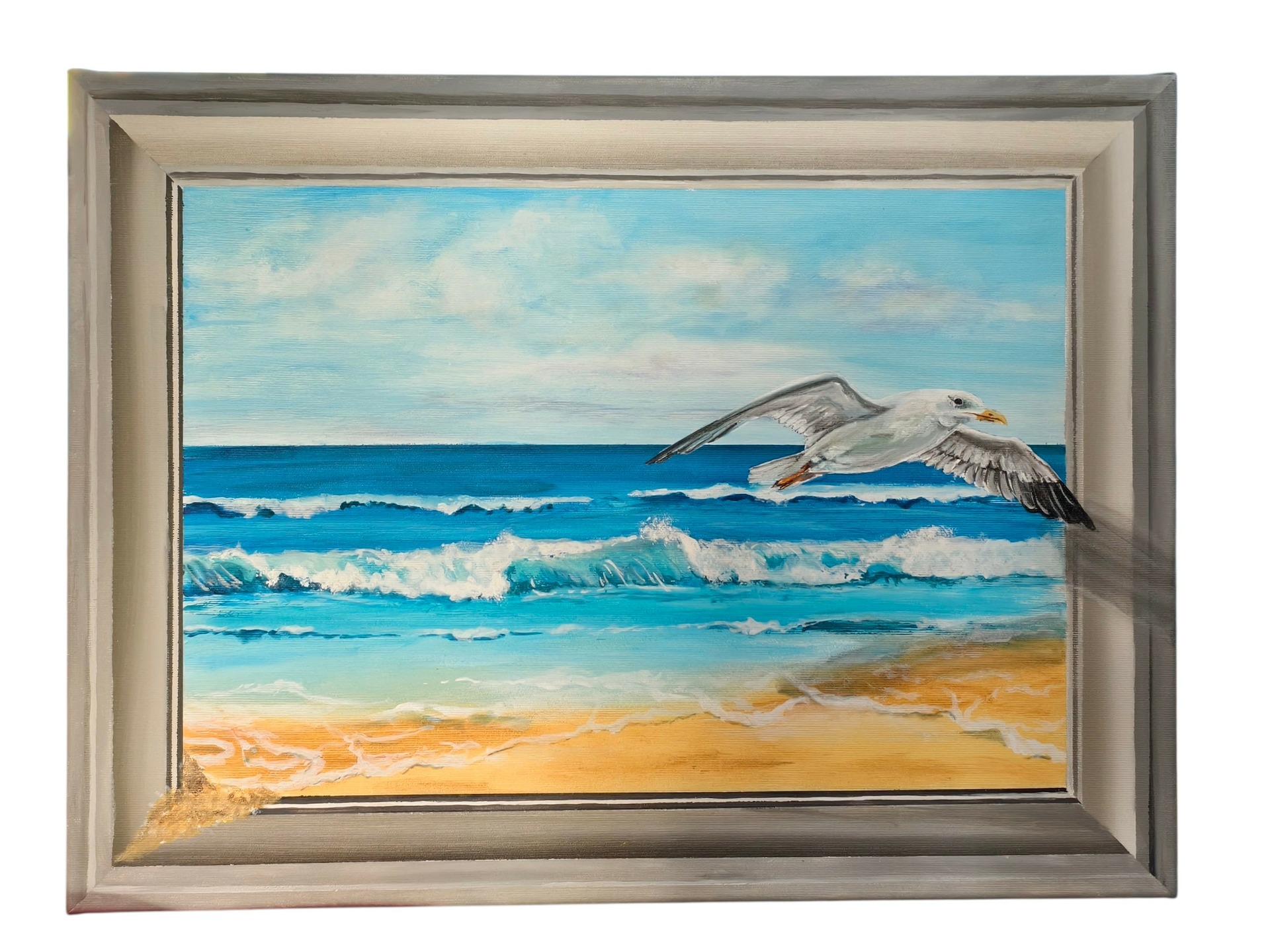 In diesem Tagesworkshop entsteht Schritt für Schritt ein maritimes Bild mit besonderer Tiefenwirkung. Ein Strand mit Wellen, der durch einen gemalten Rahmen wie ein Fenster zum Meer wirkt.
